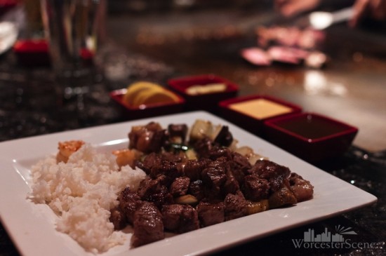 The menu offers lots of variety including hot and cold appetizers, sushi, sashimi, soups and of course, the hibachi dinner menu. I started my meal with an appetizer of himachi (yellow tail) and tako (octopus) sashimi, both of which were flavorful and fresh. For my main course I chose the sirloin hibachi dinner looking forward to not only the food, but also the show that comes along with the whole hibachi dining experience. The first course served was a dark, rich and delicious Japanese onion soup followed quickly with a house salad complete with a tangy and flavorful ginger dressing. Our chef arrived at the hibachi table and began his preparation. He introduced himself, got the hibachi orders set and proceeded to grill some shrimp flambé appetizers for the table. He then diced and cooked some veggies and proceeded with the customary show…flipping veggies with his spatula for us to catch in our mouths, the flaming onion volcano, the egg cracking and the skillful cooking utensil juggling.