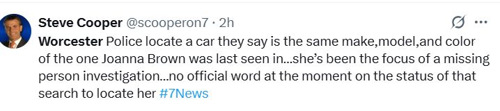 7News reporter Steve Cooper posted on social media that Worcester Police located a car of the same make, model, and color that Brown was last seen driving.